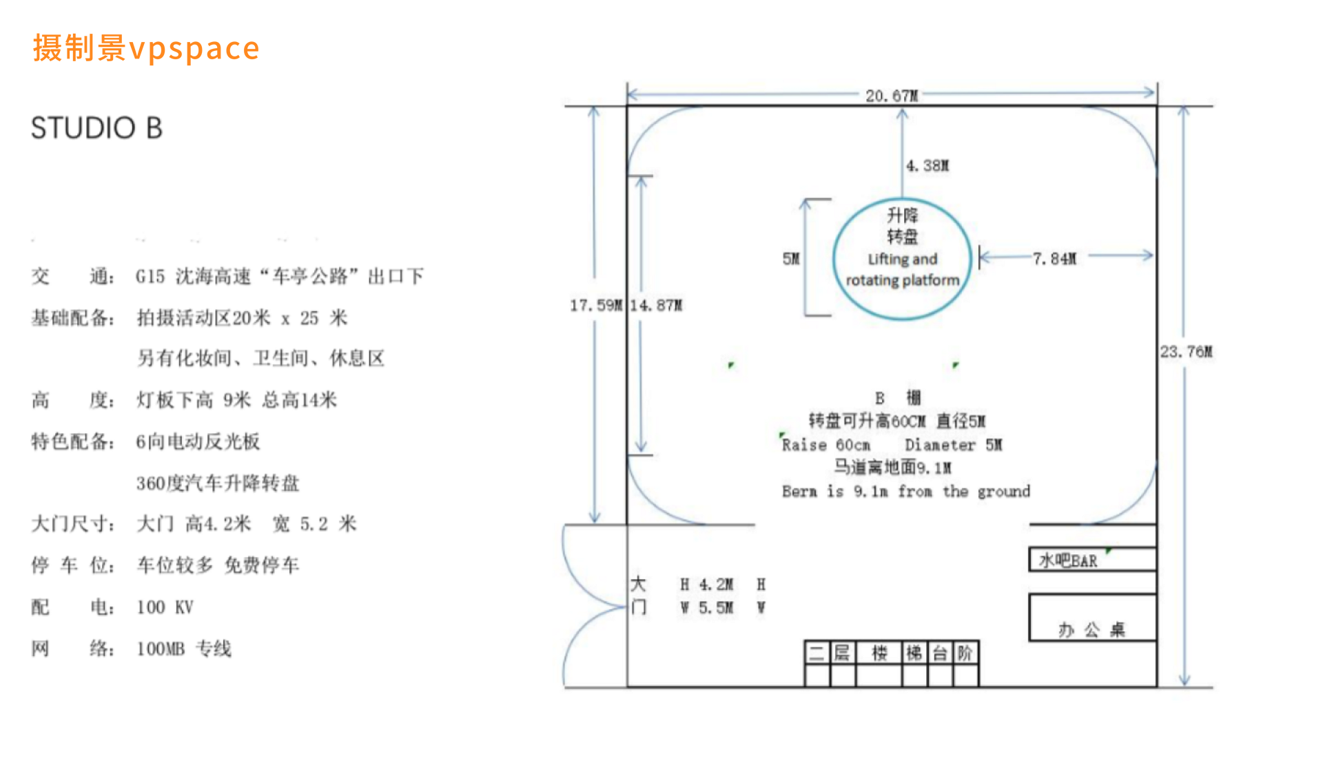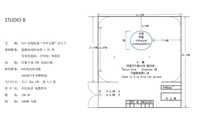 长度25米X宽度20米 ,高 14米, 500平米,顶布13X10米 (升降旋转平台直径5米 升高60CM)